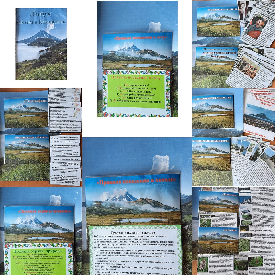 Лэпбук создан для старшей и подготовительных групп. В нем собраны географические данные, исторические события, достопримечательности Камчатского края и исторические памятники, выдающиеся земляки и материриально - духовная культура, животные и растения занесеные в красн книгу, а так же памятки "Правила поведения в лесу, в походах и охраны природы"
