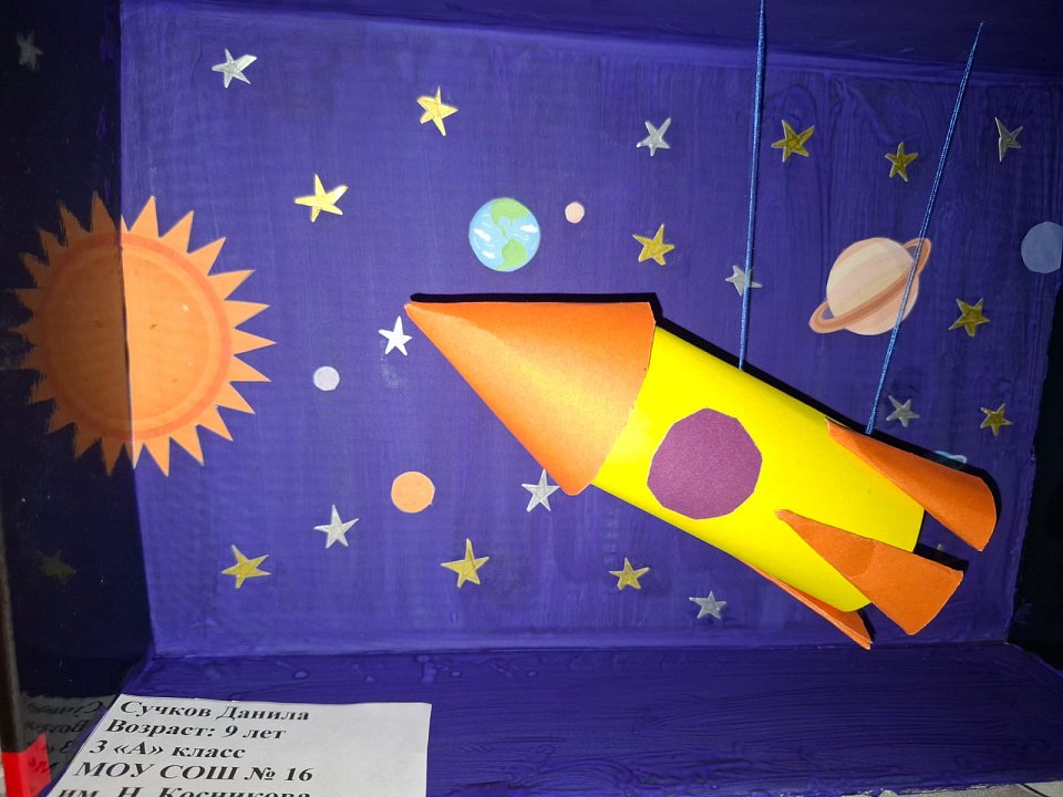 В поделке изображена ракета, которая отправляется в космос. Использованы яркие цвета, чтобы привлечь внимание. На фоне видны звезды и планеты, что создает атмосферу космического путешествия. Работа выполнена аккуратно, с вниманием к деталям, и передает чувство удивления и исследовательского духа.