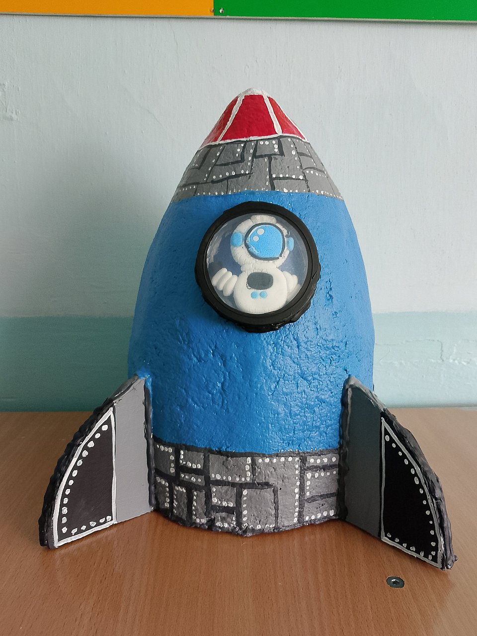Использованные материалы: картонные коробки, клей, бумага. Для каркаса корабля была использована фольга. Космонавт был сделан из мягкого пластилина.