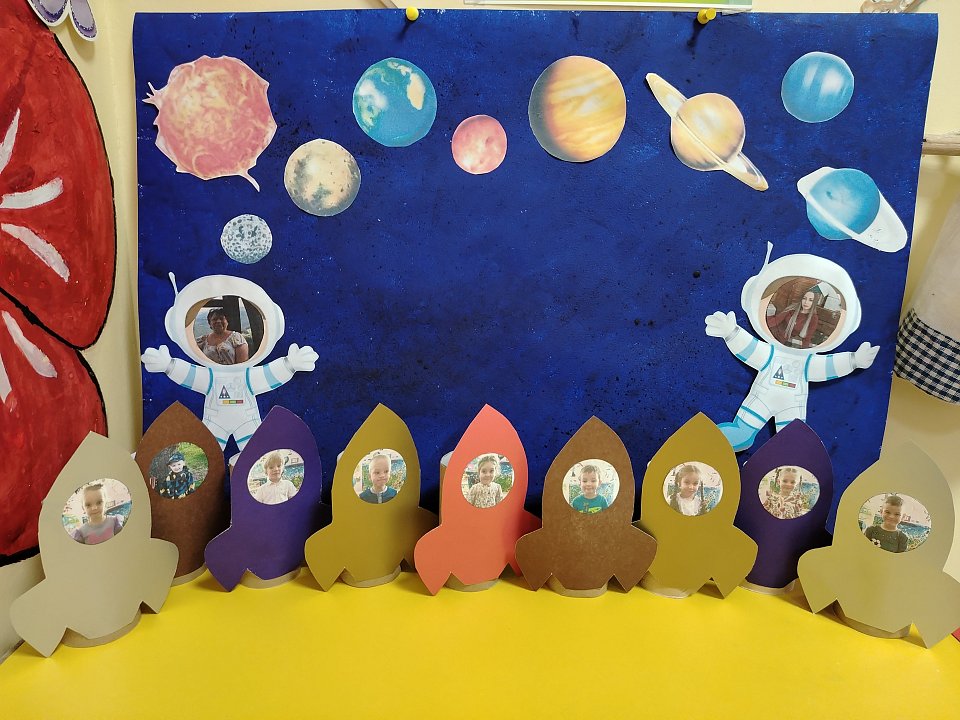 Участники дети средней группы 4-5 лет. Для работы использовался ватман, гуш, губка, зубная щётка. Изображения планет, космонавтов. Рекаты выполнены из цветного картона, приклеины на втулки. Наклеены фото детей и воспитателей группы.