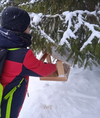 Я с папой смастерил кормушку для птиц. Всю зиму я насыпал в неё зёрнышки, хлебные крошки, семена растений. Зимой я им помогаю, а потом они помогают нам.