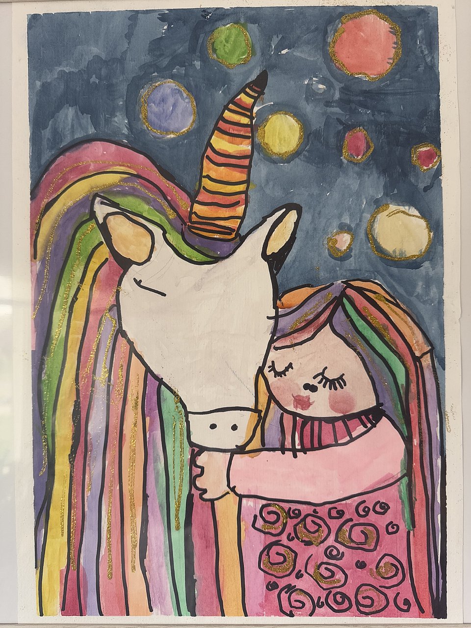 Катерина Диггинс, 4 года. Акварель, фломастеры, блестящий клей.