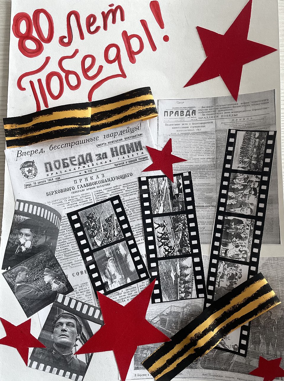 Возраст 6 лет , открытка -аппликация.Материалы черно -белые фотографии,маркеры.