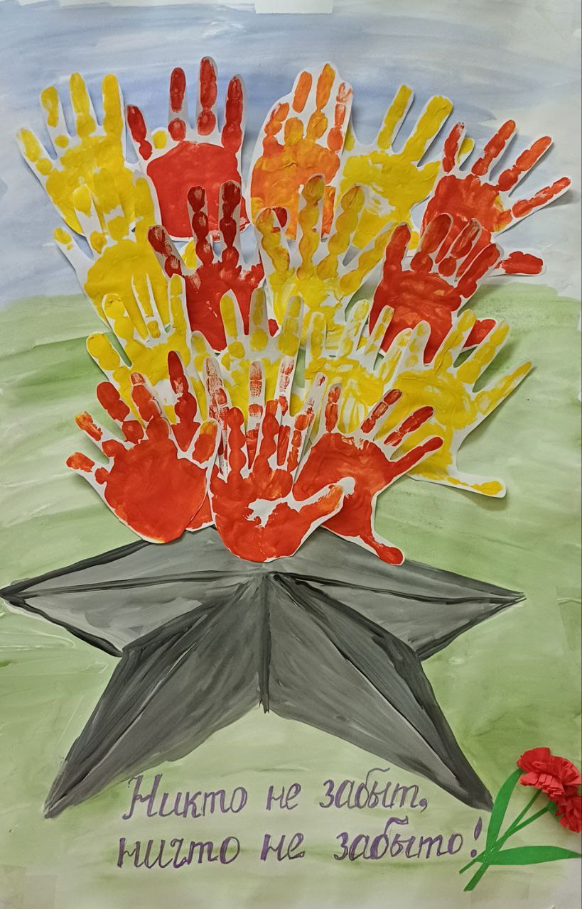 Рисунок выполнен гуашью, с ипользование детских ладошек