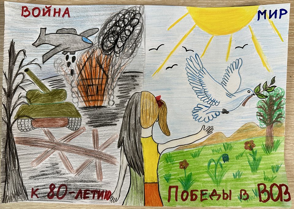 Возраст участника - 4 года. Работа выполнена простым и цветными карандашами, а также фломастерами. На этом рисунке изображено то, как сказалась война на детях и как она отразилась в их глазах. А также то, как повезло нам жить в мирное время, когда светит солнце и птички поют.