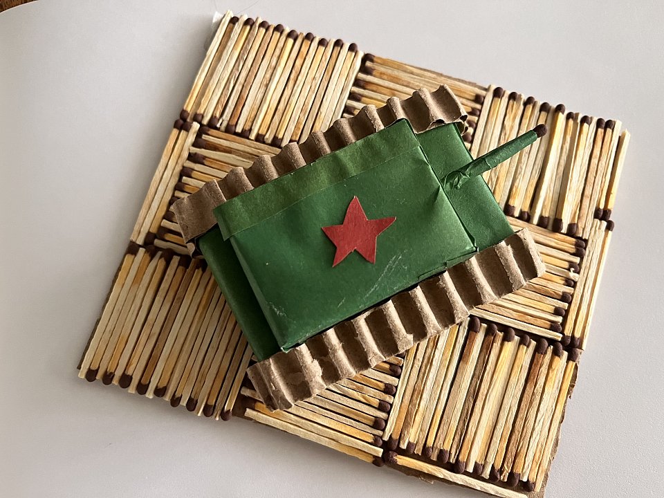 работа выполнены Надеждой 3,5 года. Техника выполнения подставки для танка победы - шахматное полотно из спичек.