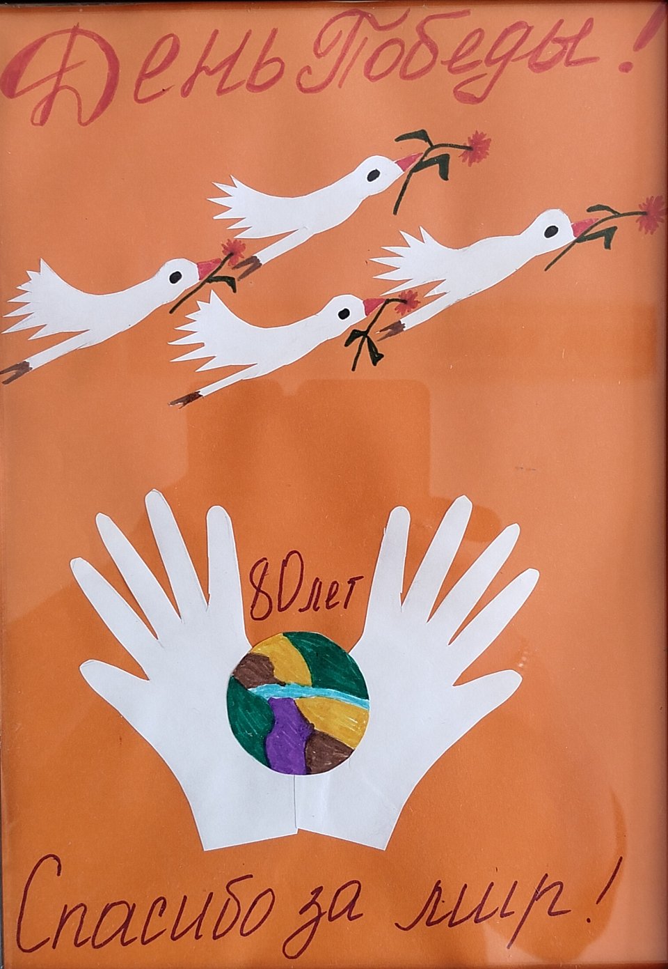 Иван 6 лет использовал в работе белую бумагу, трафареты журавлей, свою кисть, карандаш, ножницы и клей- карандаш. Обвел по трафарету журавлей, вырезал, наклеил на цветной картон, обвел кисти руки, вырезал, наклеил. Между ладонями наклеил круг и раскрасил фломастерами под цвет глобуса.