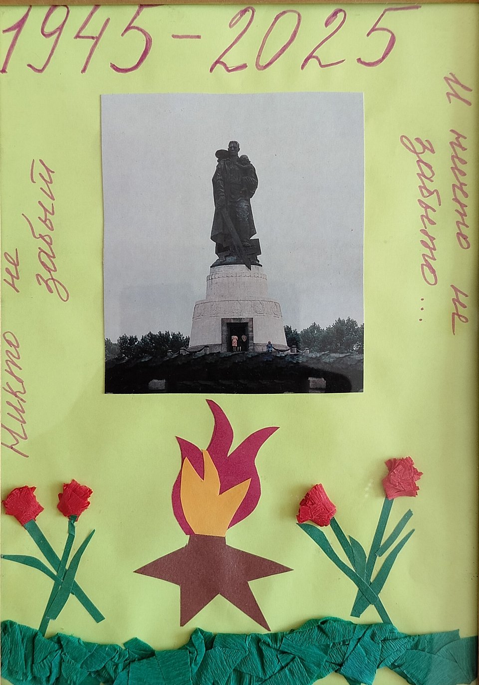 Арина 6 лет использовала гафрированную бумагу красного, зеленого цвета, цветную бумагу для "вечного огня", ножницы, клей. Используя фотографию , где изображен памятник , наклеила в центр , затем из цветной бумаги вырезала пламя огня, подставку для вечного огня , из гофрированной бумаги сделала гвоздички, из зеленой сделала венок у подножия вечного огня, воспитатель помог написать надписи.