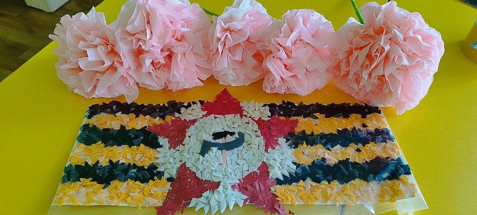 Георгиевская лента и цветы выполнены в технике аппликации, используемые материалы - картон, фетр, цветная и гафрированная бумага.
