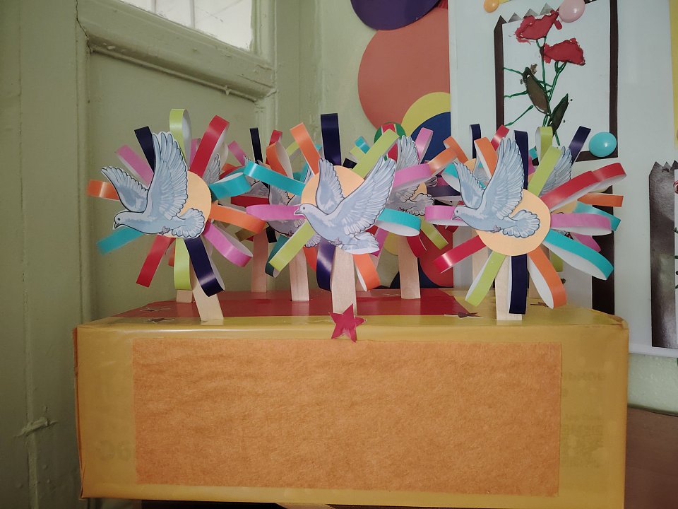 3 года, аппликация, цветная бумага, изображение голубя, клей
