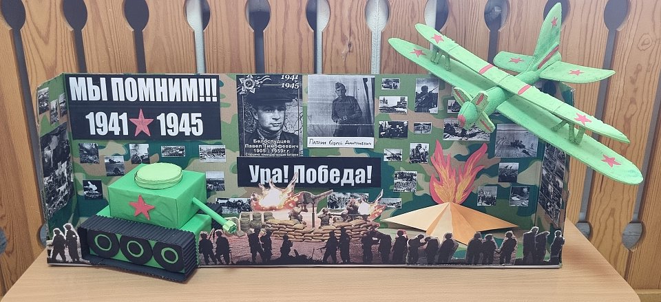 Использовали: картон, цветная бумага, клеевой пистолет, пенопласт, краски, распечатанные фото участников Великой Отечественной Войны