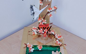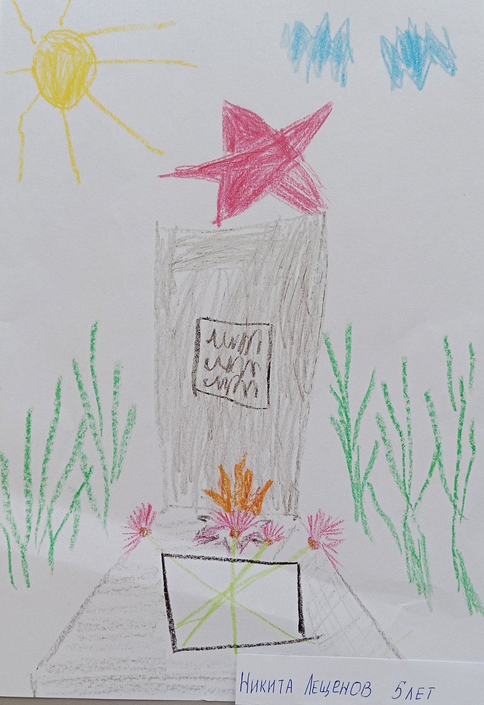 Никита изобразил вечный огонь у обелиска, который он видел при возложении цветов.
