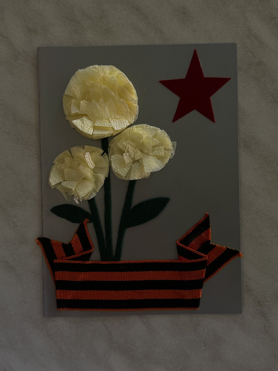 Участнице 4 года, работы выполнена в технике аппликация с использованием салфеток, фетра и настоящей тканевой георгиевской ленточки