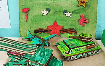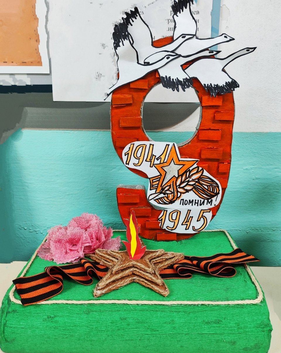Возраст участника 6 лет , работа выполнена из бумаги, картона, нити, георгиевская лента.