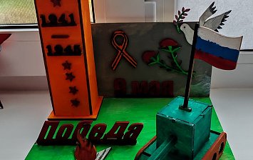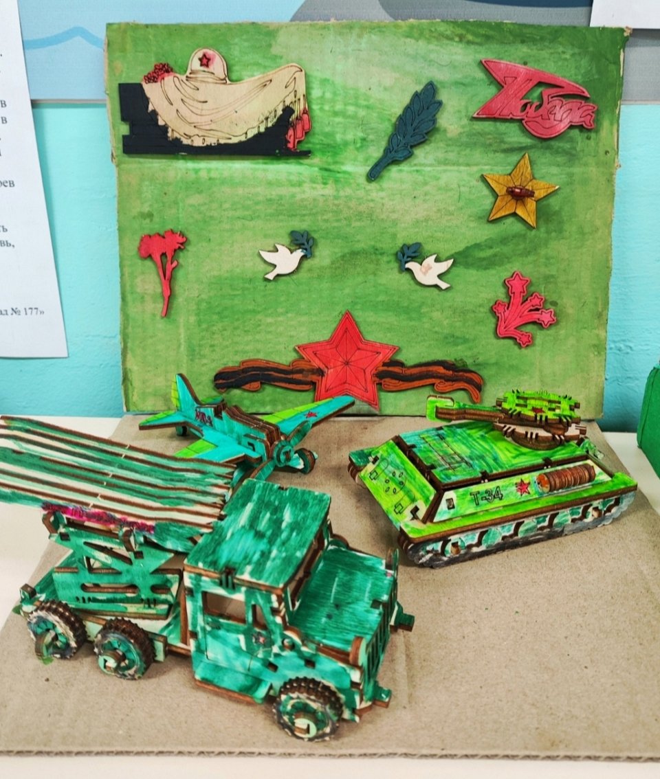 возраст участника 5 лет, работа выполнена с использованием материалов- картон, макеты военной техники из тонкой фанеры.