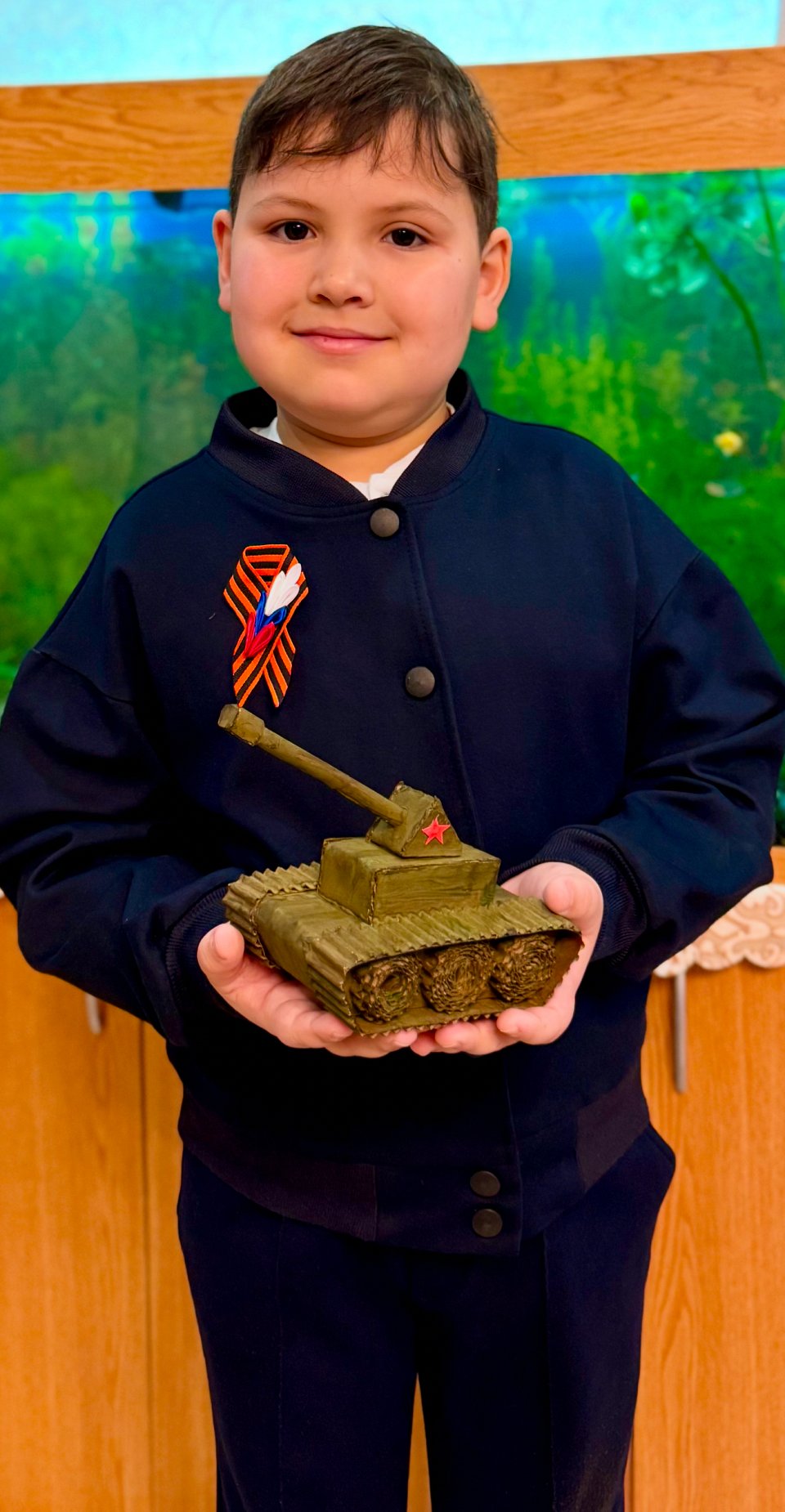 Выполнен танк из картона, покрасили зеленой гуашью, участнику 8 лет