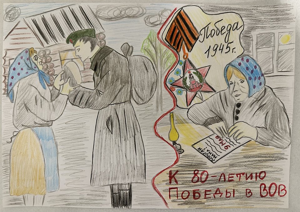Автору рисунка 11 лет. В преддверии великого праздника, значимого для нашей страны, была создана данная работа. В основе идеи лежит история из жизни прапрадеда, который молодым ушел на фронт, прошел всю ВОВ и дошел до Берлина. Оттуда он прислал письмо своей матери.