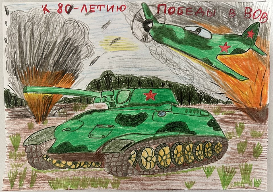 В прошлом году участник впервые вживую присутствовал на Параде Победы, где увидел много военной техники. Это было зрелищно! Предстоящее мероприятие в этом году вдохновило его создать рисунок, на котором изображен момент на поле боя, где наши солдаты на танке и самолете движутся вперед к Победе!