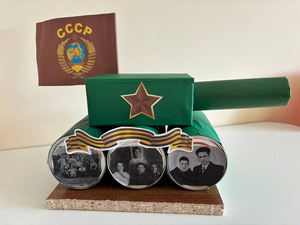 Морозов Антон, 8лет. Поделка танк с фотографиями его членов семью, участвовавших в ВОВ,выполнена из консервных банок, цветной бумаги и картона.