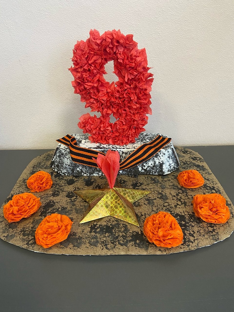 Работа выполнена в технике объёмной аппликации с элементами живописи. Вечный огонь, цифра "9" и георгиевская лента символизируют связь поколений и благодарность героям войны. Цветы, созданные из бумаги и дополненные красками, придают композиции динамику и праздничность. Сочетание разных материалов подчёркивает глубину памяти: картон как основа — это стойкость, а яркие краски — радость Победы.