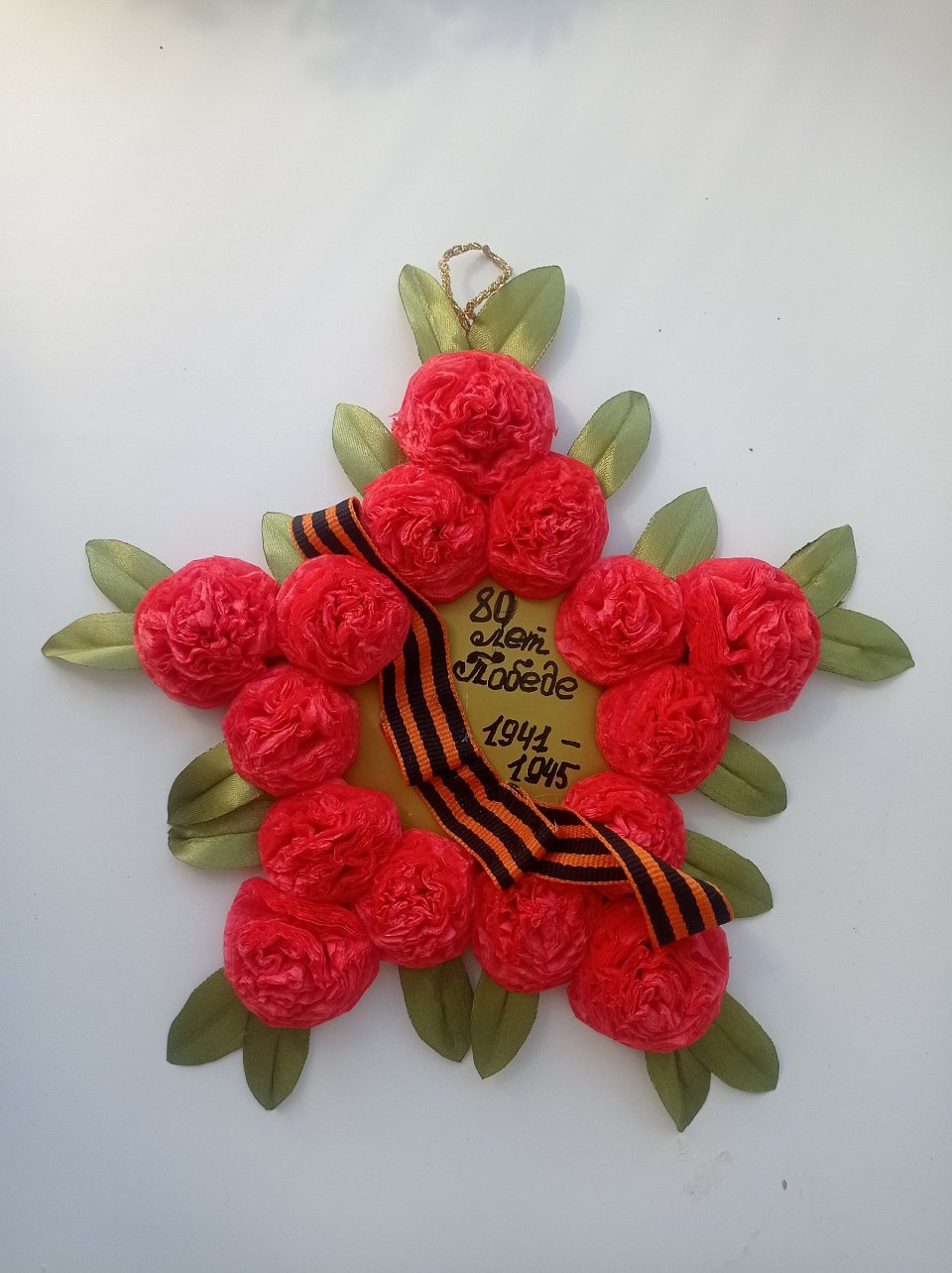 Панно посвящено теме Победы и сочетает в себе торжественность и изящество. Центральный элемент — ветвь, символизирующая возрождение и мир, переплетается с яркими цветами, которые олицетворяют жизнь и благодарность героям. Георгиевская лента, интегрированная в композицию, напоминает о воинской доблести и жертвах войны. Работа выполнена с акцентом на контраст: нежность цветов и текстура лент противопоставлены строгости георгиевской символики.