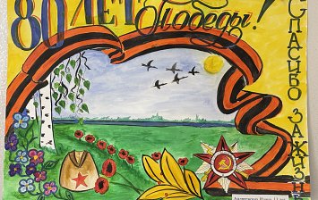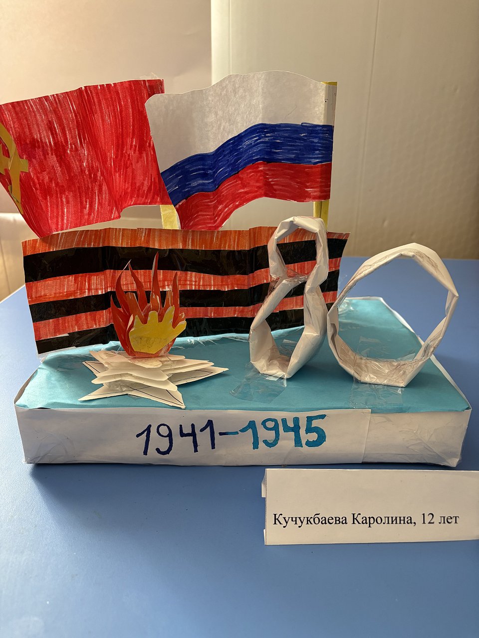 12 лет. Работа выполнена из листа ватмана с использованием фломастеров, цветной бумаги, скотча. Объёмной фигуру вечного огня делают повторяющиеся изображения, скрепленные между собой скотчем.