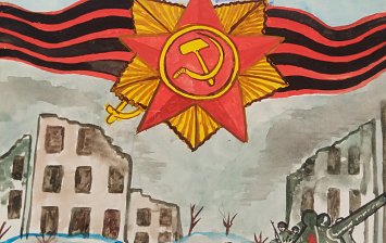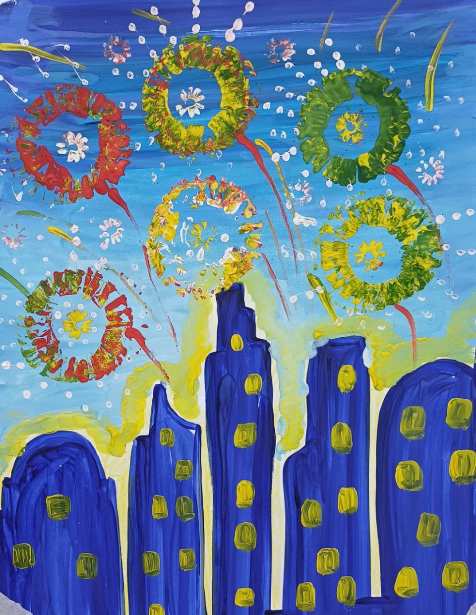 Рисунок выполнен гуашью, с использованием бумажных втулок и ватных палочек.