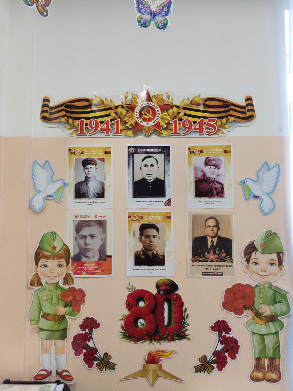 Оформление в группе стены памяти, посвященной ветеранам ВОВ. Фото ветеранов предоставили семьи воспитанников группы.