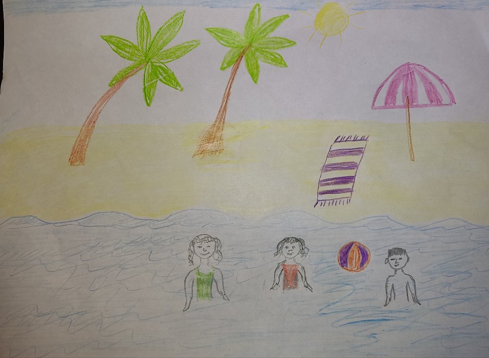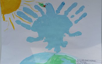 Участнику 6 лет. Для выполнения данной работы ему понадобился альбомный лист, влажные салфетки, восковые мелки, цветные и простые карандаши