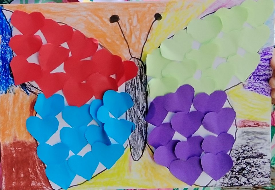 Аппликация с элементами рисования. Бабочка выполнена аппликацией сердечками из бумаги.
