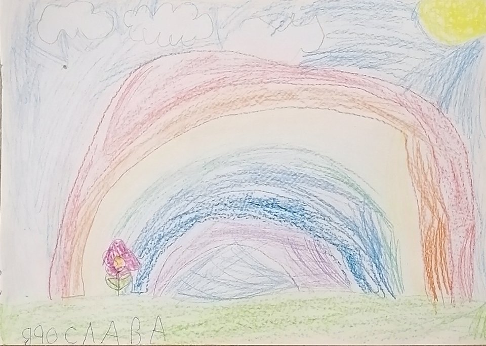 6 лет. Карандаши и альбом. Рисование в детском саду. Из окна увидела после дождя радугу и потом возникло желание нарисовать радугу.
