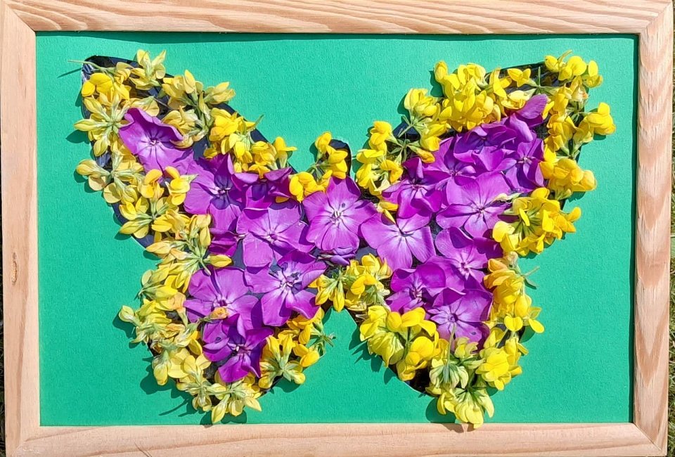 6 лет,выкладывание живых цветов по трафарету,в данной работе были использованы: картон,скотч,живые цветы