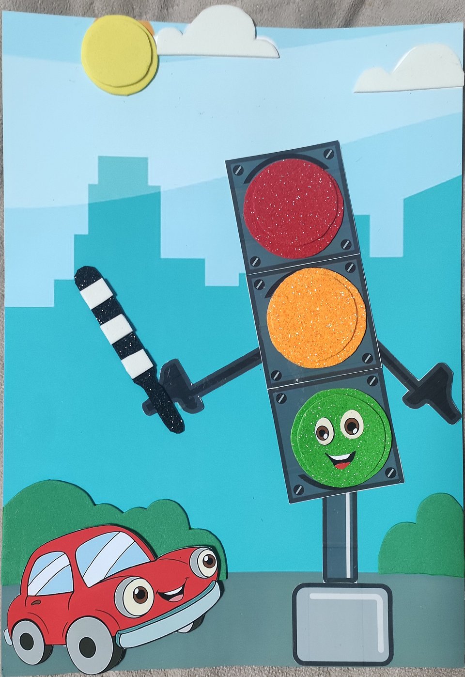 Ребёнок 3 года. Работа выполнена в стиле аппликаций ( подделки). В работе использовали материалы : фоамин, фоамин глитерный, материалы распечатанные на плотном картоне, клей,фломастеры.