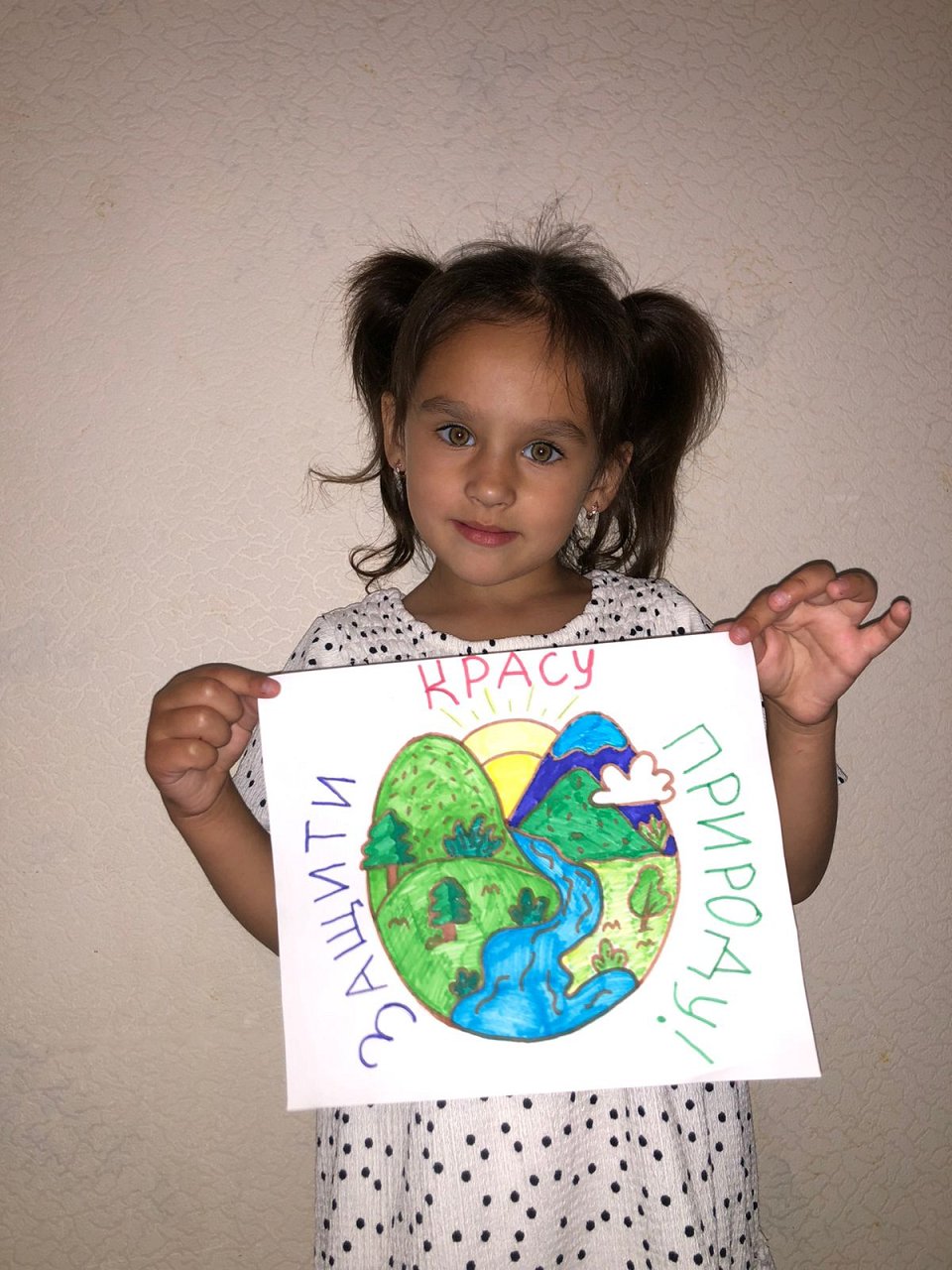 Банникова Лера, 5 лет, рисунок на тему" Экология." Название "Защити краску природы"! Работа выполнена гуашью, цветными карандашами.