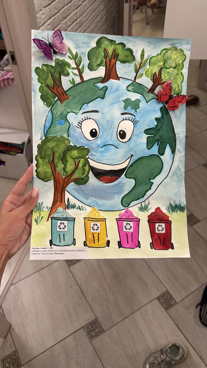 Рисунок Агеевой Алисы выполнен акварельными красками и фломастерами, аппликация из 3-д бабочек