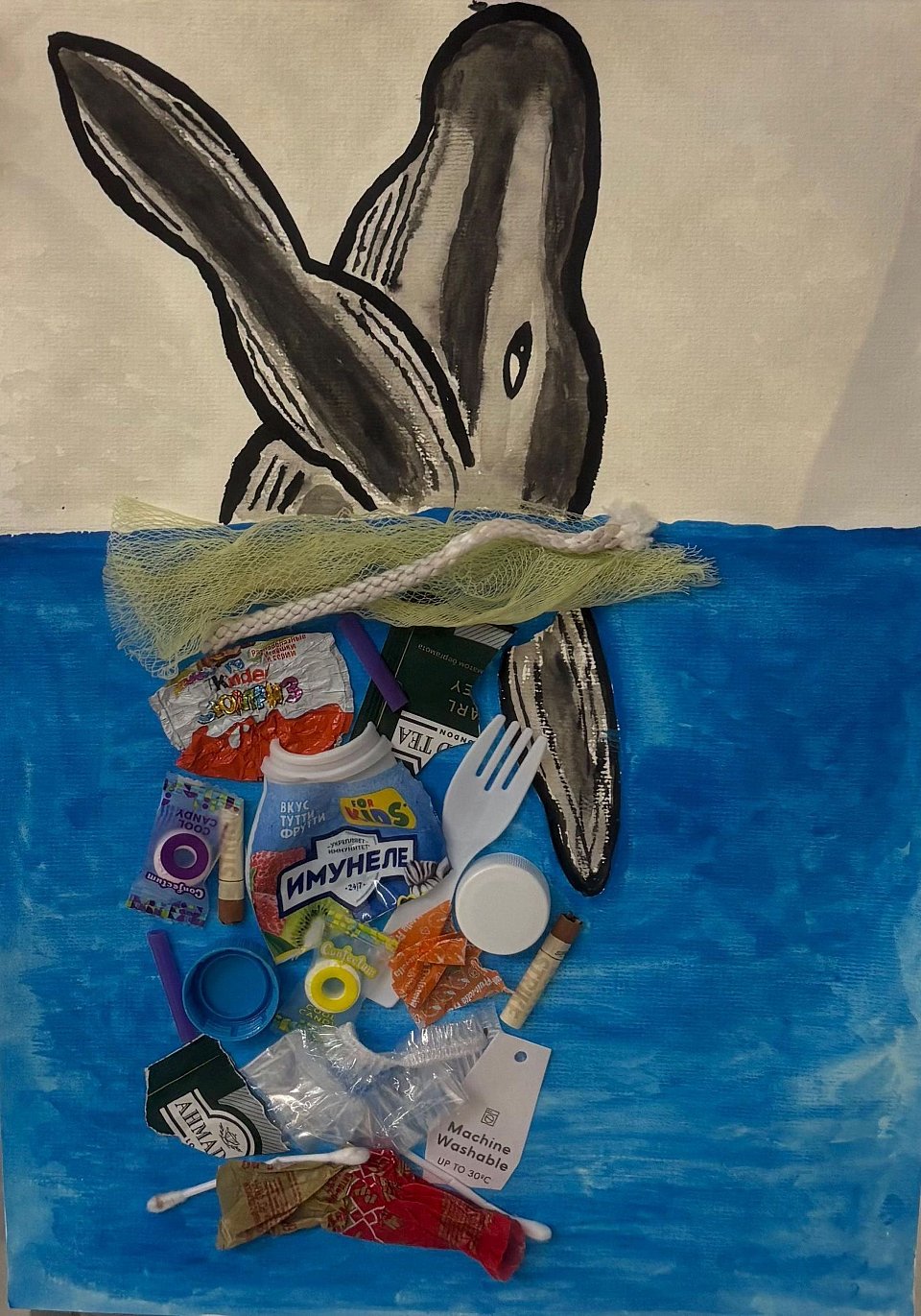 Работу выполнил ученик 1 В класса Гостеев Марк - 7 лет. Для создания использовались следующие материалы: Кит - выполнен акриловыми красками. Мусор: настоящие пластиковые предметы, такие как упаковка, вилки, крышки, рыболовная сеть другие отходы.