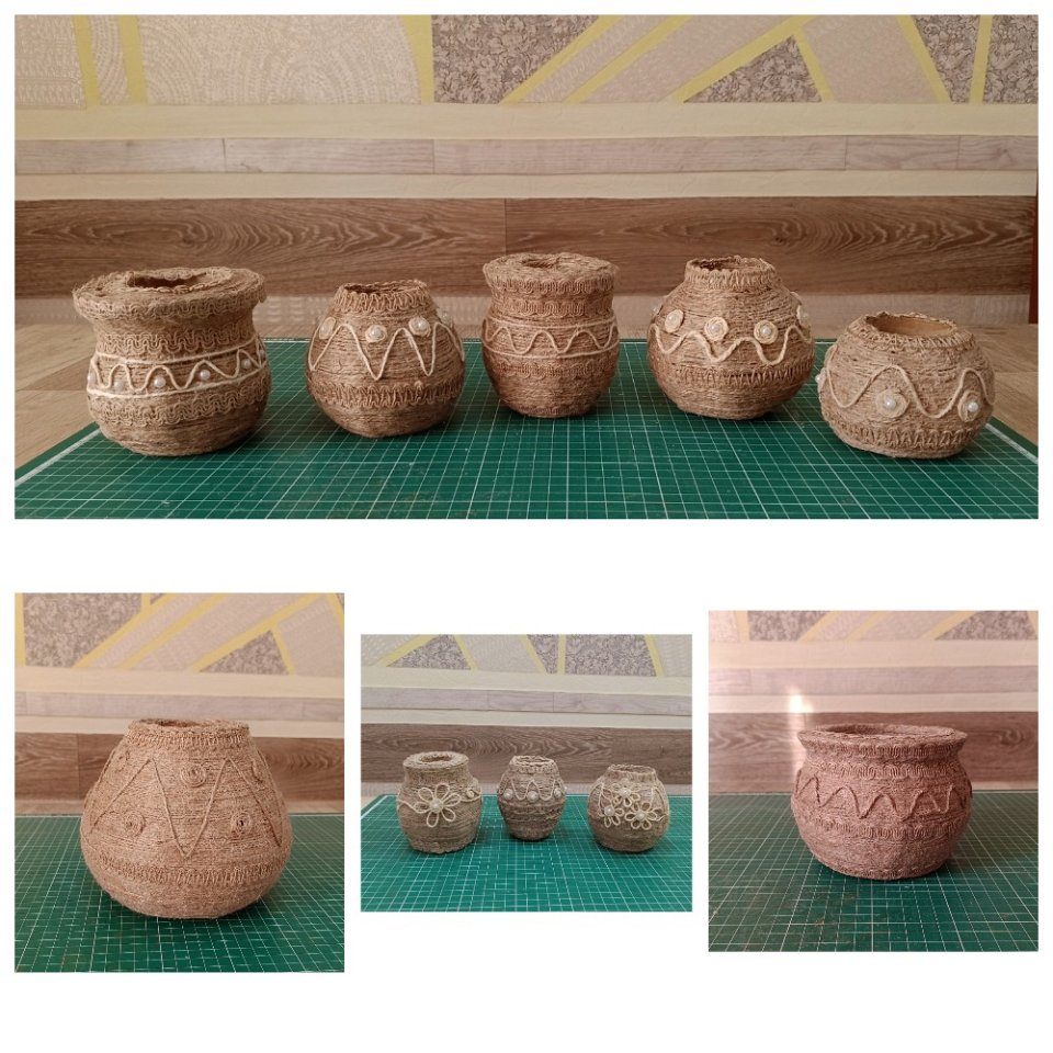 Участники кружка "Вдохновение" , 8-14 лет изготовили из бросового материала - картонных коробок вазы, которые идеально украсят любой интерьер. Основа вазы - обыкновенные втулки, обклеенные вырезанными полосками картона. Декор вазы из джутового шпагата.