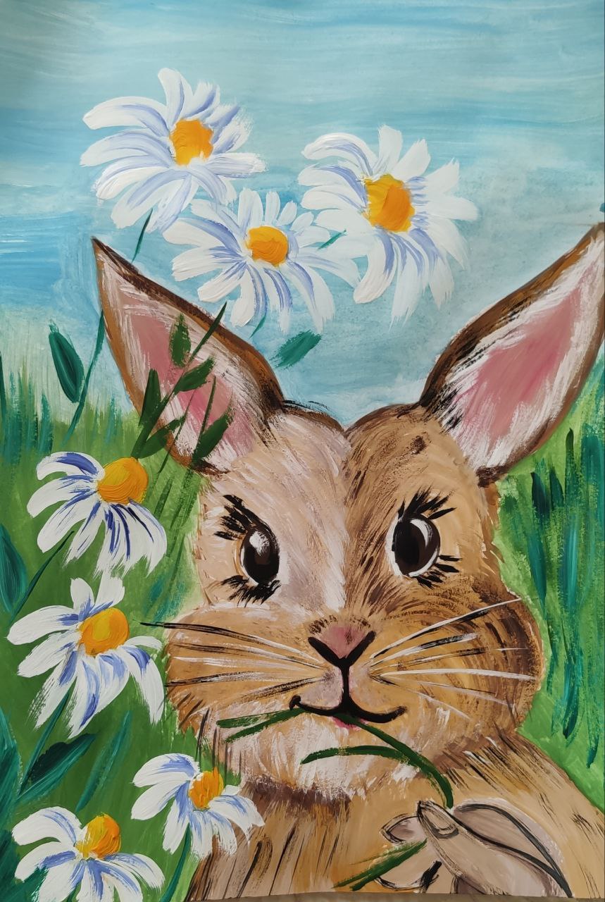 Мисюрин Михаил, 6 лет очень давно мечтает завести у себя дома кролика, но пока...только рисует его везде и всегда. Данный рисунок выполнен красками Гуашь.