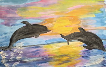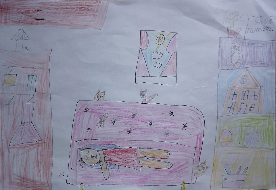 Мне 8 лет. На рисунке изображена мама кошка со своими котятами. Маленькие шустрые котята не дают маме отдохнуть.