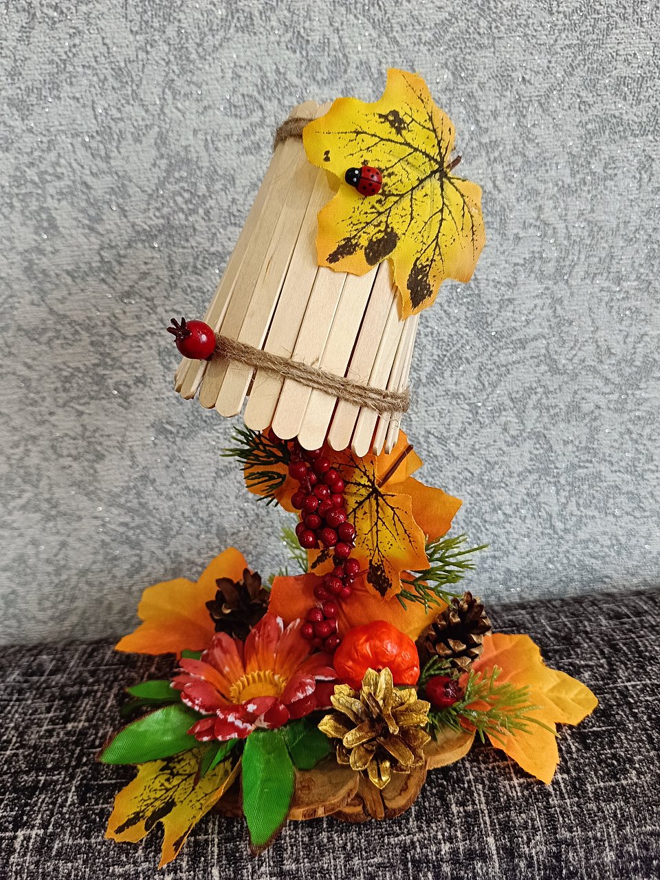 Участнику 6 лет, работа посвящена ярким краскам и дарам осени, в работе использованы природные материалы, джутовый шпагат, ткань, клещевой пистолет, палочки и др.