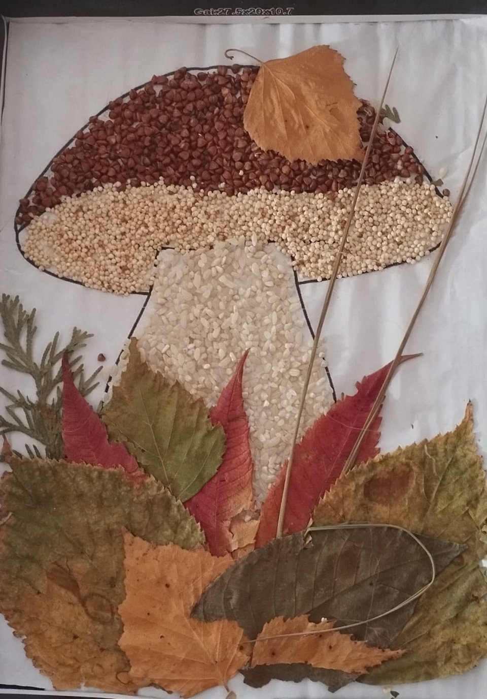Использованные материалы: сухие листья, рис, пшено и гречка. Возраст участника 5 лет