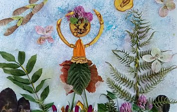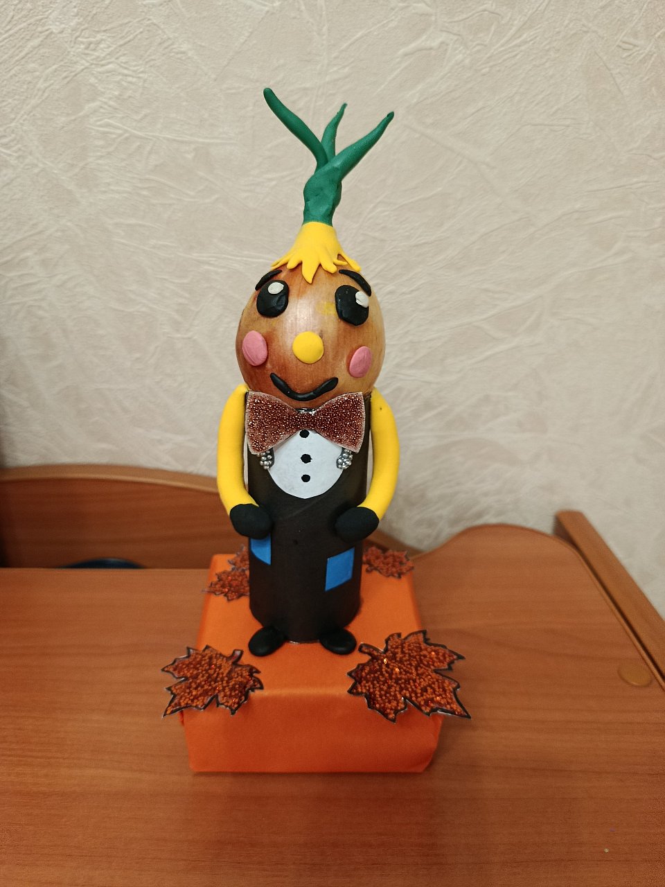 Работу выполнила Алеся, 6 лет. Использовала овощ ( лук), пластилин, цв. бумагу, клей, уф-смола и блёстки