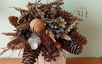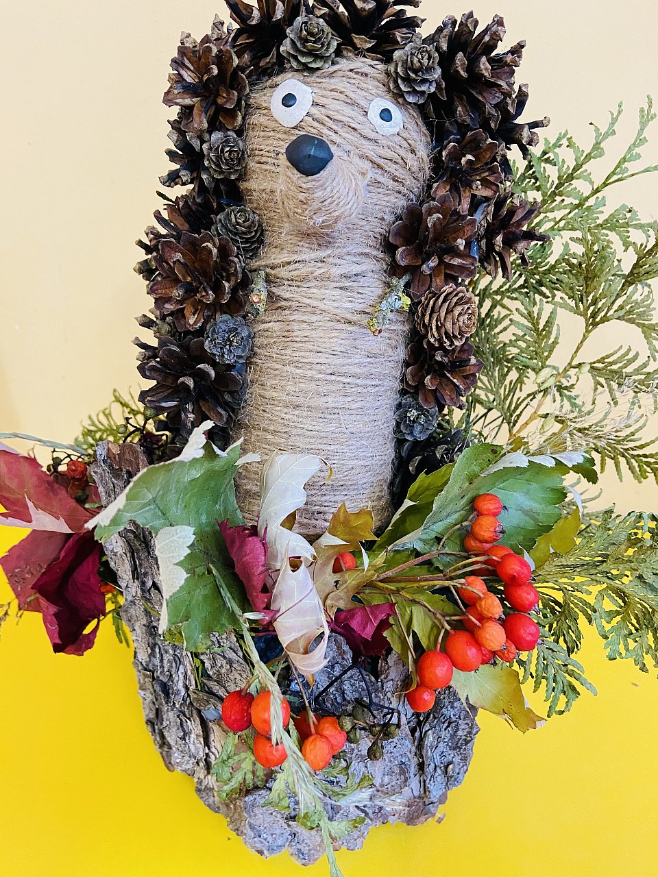 Ева -3 года , участвовала в создании ежика ( природные материалы шишки , ягодки , веточки ,клеила шишки , глазки , вставляла веточки еловые ..