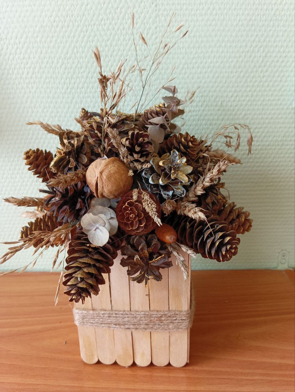 Выполнила воспитанница подготовительной группы. Ваза для букета сделана из шпателей, букет выполнен из шишек, скорлупы грецкого ореха, желудей и пшена.