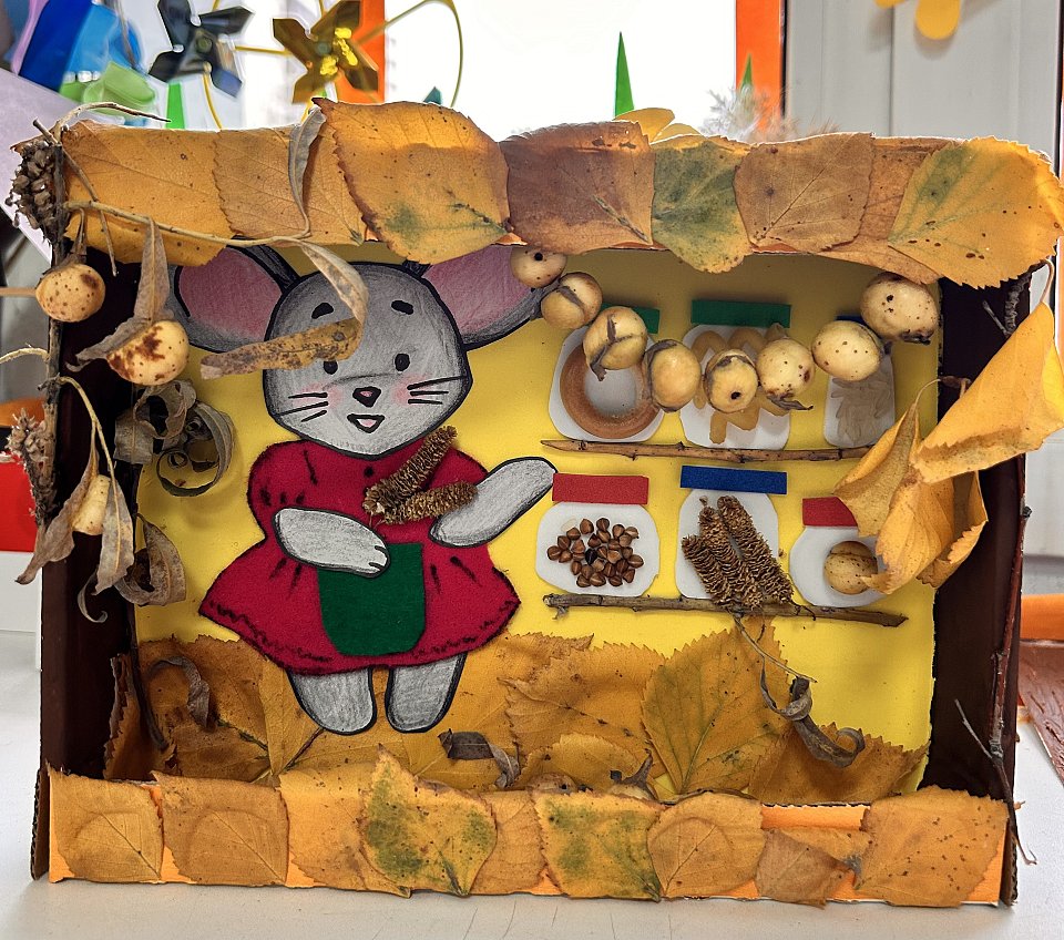 Коробка, листочки, клей, орешки, цветная бумага, цветной карандаш