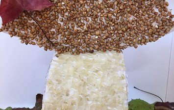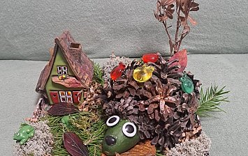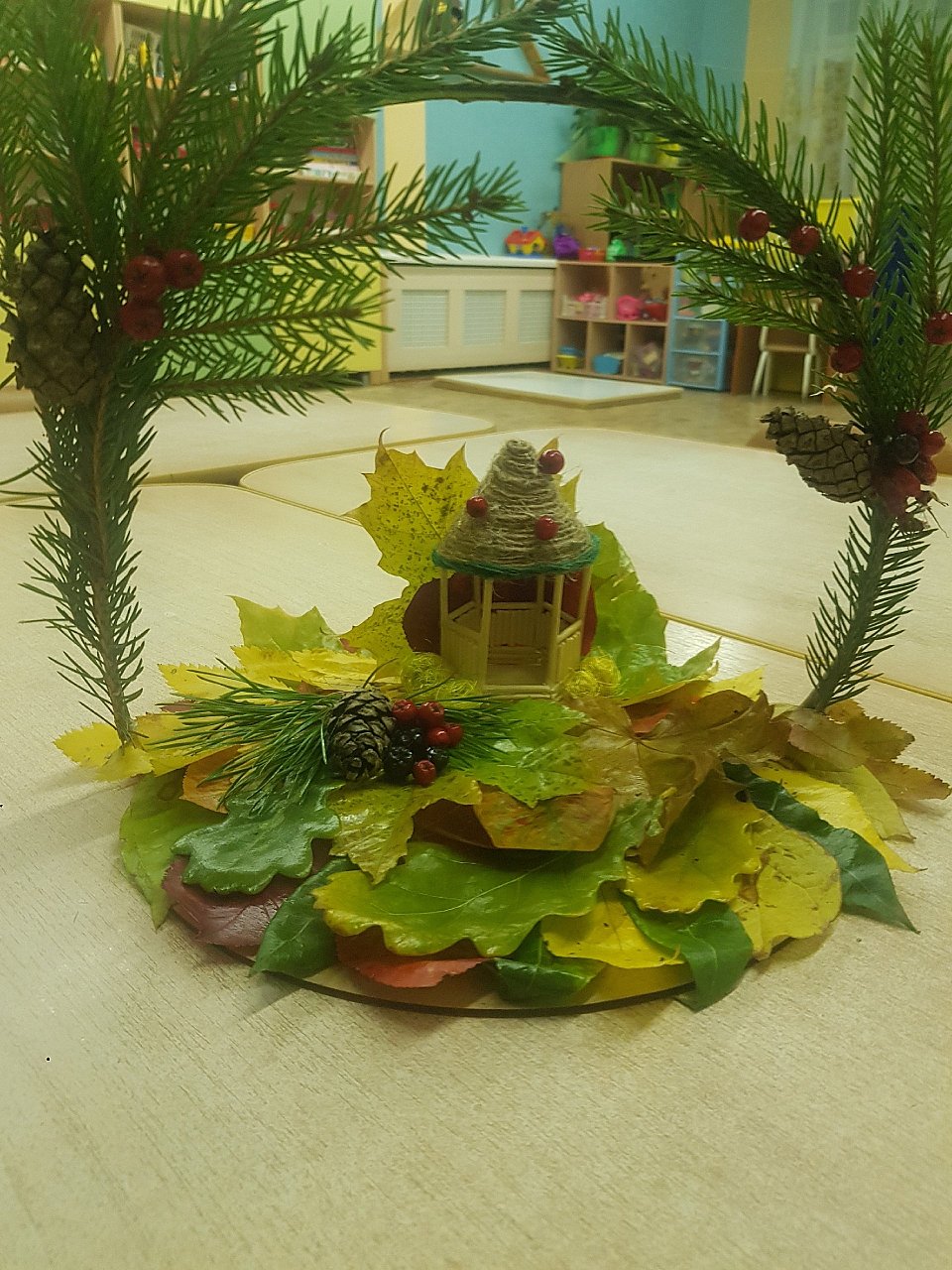 Работа выполнена с использованием осенних листьев, пластилина, еловых веточек, шишек, ягод рябины..