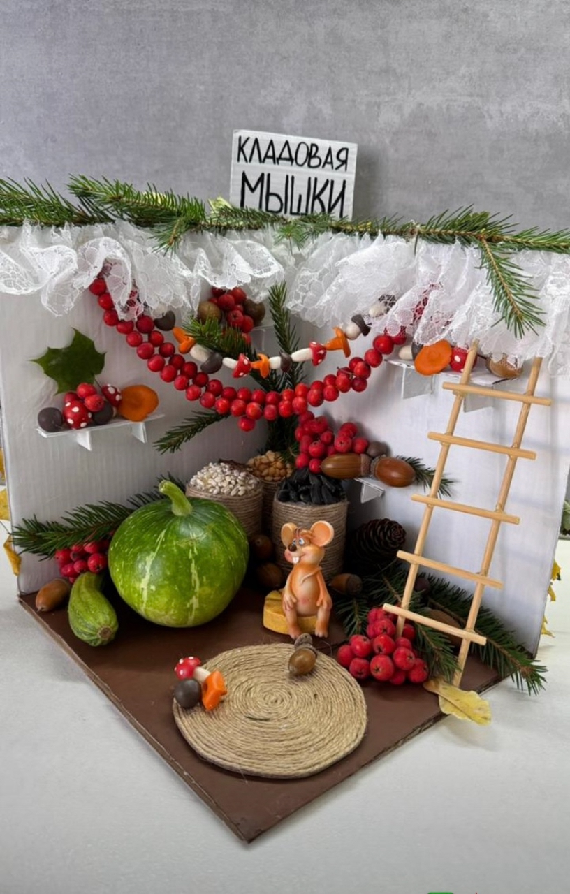 6 лет. В работе «Кладовая мышки» автора Гусаровой Полины применялись желуди, семечки тыквы , ягоды рябины, жёлуди, веточки и листья.