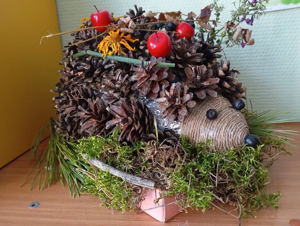 6 лет , аппликация, сосновые шишки, клей- пистолет, верёвка, цветы, фольга