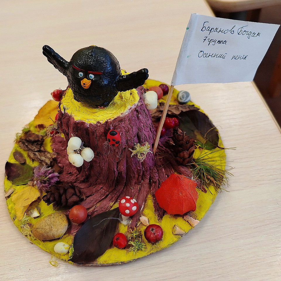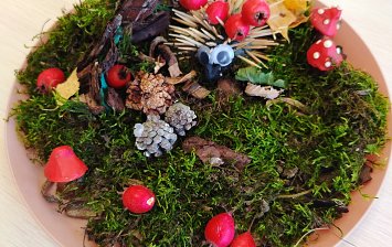 Изображена лесная сцена с пеньком посередине, на котором сидит галчонок. Вокруг пенька расположены грибы, ягоды и другие элементы природы. Работа выполнена из природных материалов