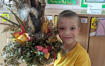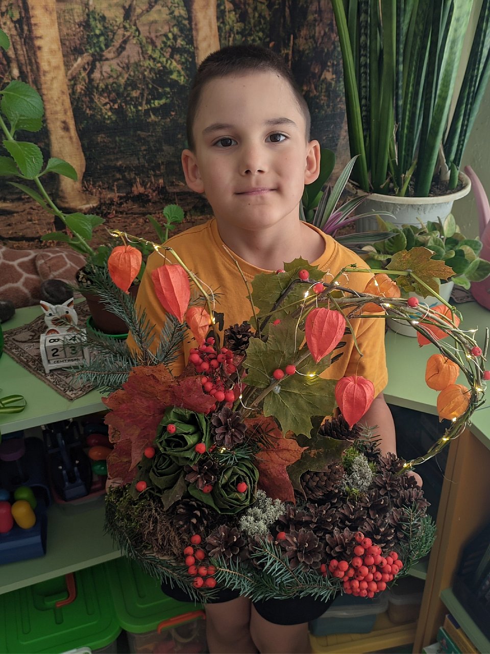 Александру 6 лет. Осенняя поделка выполнена из природных материалов (еловые и сосновые шишки, еловые ветки, рябиновые ветки, мох, ветки физалиса, кленовые листья) и светящейся гирлянды.